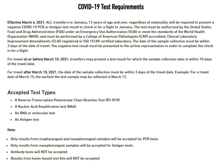 Effective March 10, 2021, all visitors, regardless of residence or nationality must present a negative Covid test report to enter Jamaica. Testing must occur within 3 days before arrival. This announcement occurred with no advance warning.